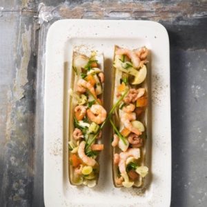 Scheermesjes met look tomaten en garnalen